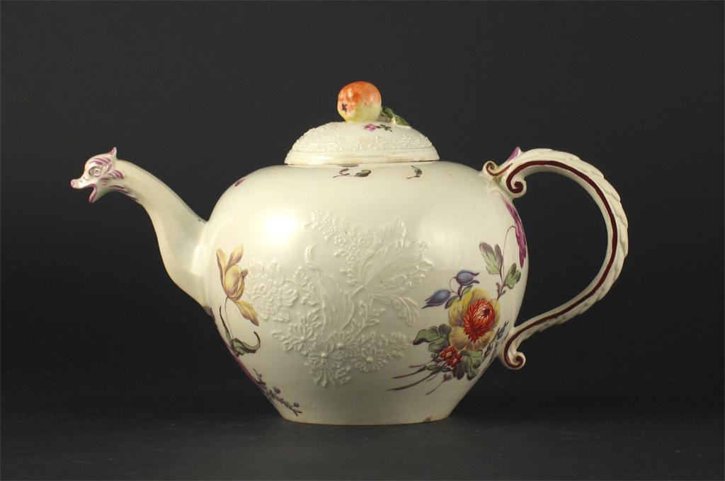 A Ludwigsburg teapot, with an associated cover, moulded and painted with flowers, crowned crossed 'C's mark. Damages. c.1750-60. (2)