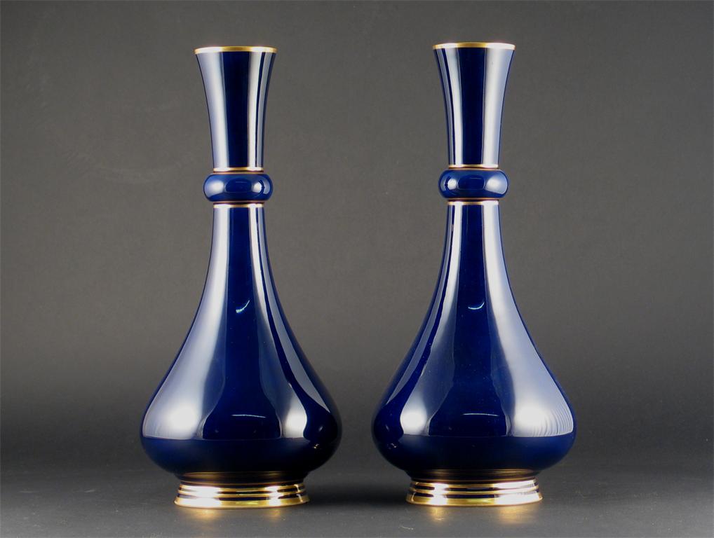 A pair of Svres blue ground vases, detailed with gilt bands. One with small footrim chips. Printed marks and dated 1877, 32.5cm.