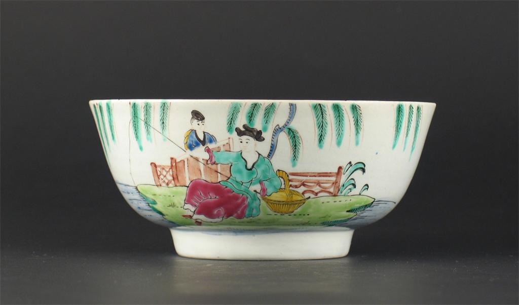 A Chaffers Liverpool bowl, painted in polychrome with La Pche with a Chinese lady fishing beneath a willow tree. Small rim chips. c.1760, 14.3cm.