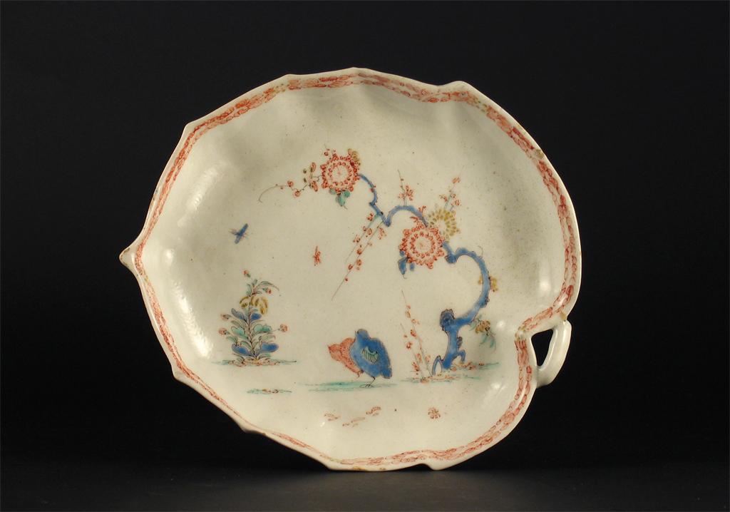 An early Bow leaf moulded dish, standing on six moulded feet, painted in pale coloured enamels in the Kakiemon style with the 'Quail' pattern. Minor faults and a later incised triangle mark c.1750-55, 17.5cm.