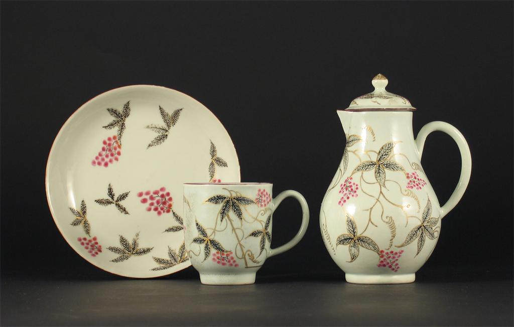 A Chaffers Liverpool sparrow beak jug and cover, painted in pink, black and gilt with a fruiting vine, c.1760. Provenance: The Rous Lench Collection, Christie's 1990, lot 386. Together with a matching Chaffers coffee cup and a Chinese saucer. A few small chips to the saucer. 12.5cm. Max. (4)