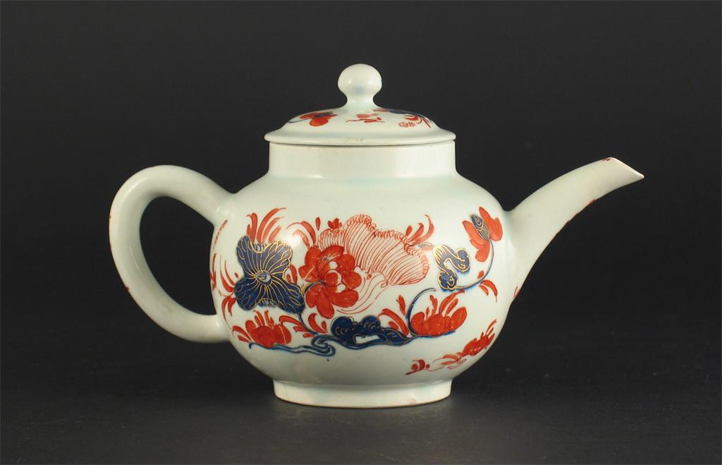 PLEASE NOTE: THIS IS BOW NOT LOWESTOFT. A Bow teapot and cover, painted in the Imari palette with lotus, '31' mark inside the footrim. Restoration to the spout and cover, cracks to the base and side. c.1770, 18cm. Long. (2)