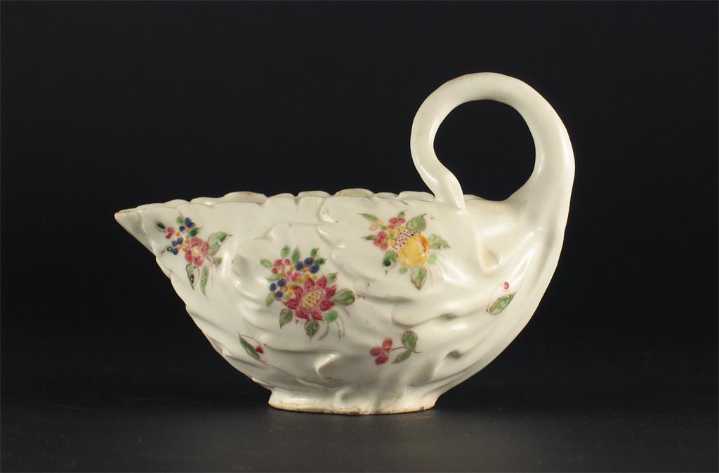 A rare Derby dry-edge leaf moulded sauceboat, delicately painted with scattered flower sprays, unmarked. A few small rim chips. c.1750-55, 13cm. Cf. J Twitchett, Derby Porcelain, p.194 for a white glazed example/
