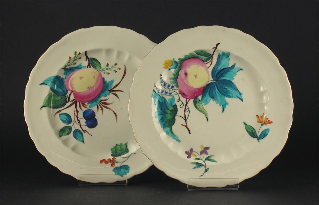 A pair of Derby plates, brightly enamelled with fruit and flower sprigs, unmarked, 2nd half 18th century, 22.5cm. (2)