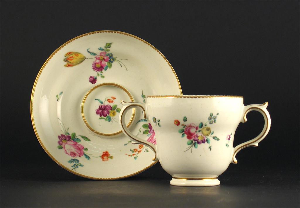 A Chelsea Derby chocolate cup, with a trembleuse saucer, painted with scattered flowers, gilt anchor and D mark. Slight wear to the gilding. c.1775. (2)