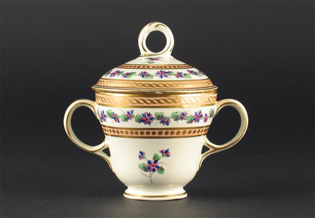 An unusual Caughley two-handled cup and cover, painted with bands and sprigs of flowers within orange and gilt borders, no marks, c.1780. (2)