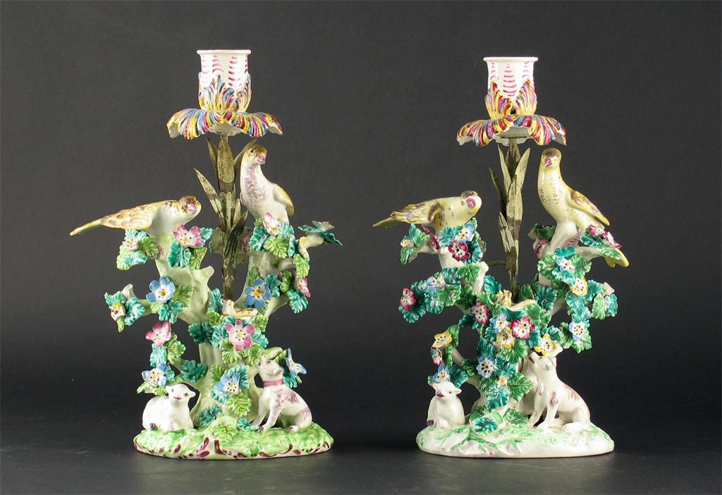 Two Bow birds-in-branches groups, each modelled with two adult birds and a nest of chicks with a dog and a lamb on the base, brightly coloured with enamels. Restoration. c.1765, 23cm. (2)