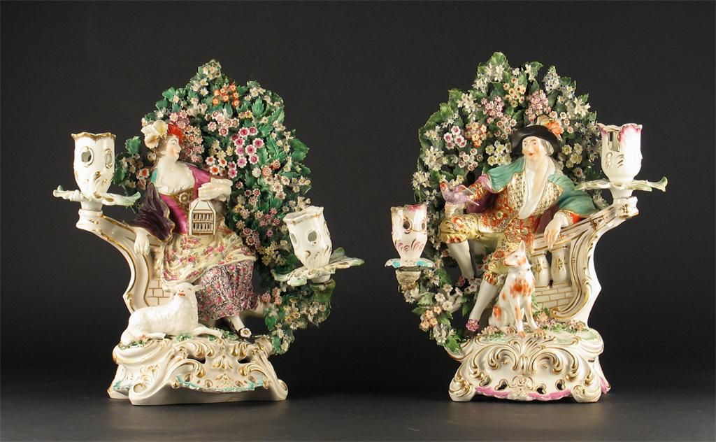 Two large Derby candlestick groups, of a young man and woman before flowers and leaves, each raised on an elaborate scrolling base. Some damages, c.1765, 30cm. (2)