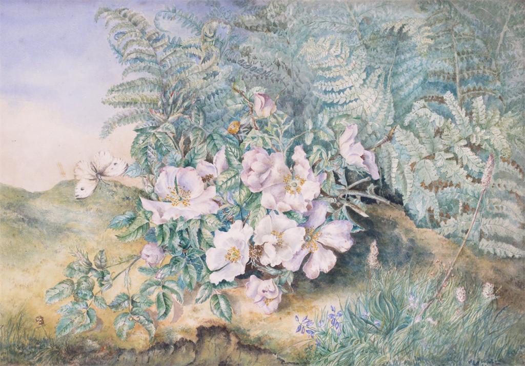 M. Poulter (early 20th Century) Wild roses and ferns on a bank Signed and dated 1901 Watercolour...