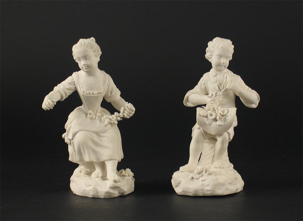 Two Derby biscuit porcelain models of a boy and girl, seated and holding flowers, incised marks, the boy incised indistinctly, possibly with a signature. Some restoration. c.1780, 10.5cm. (2)