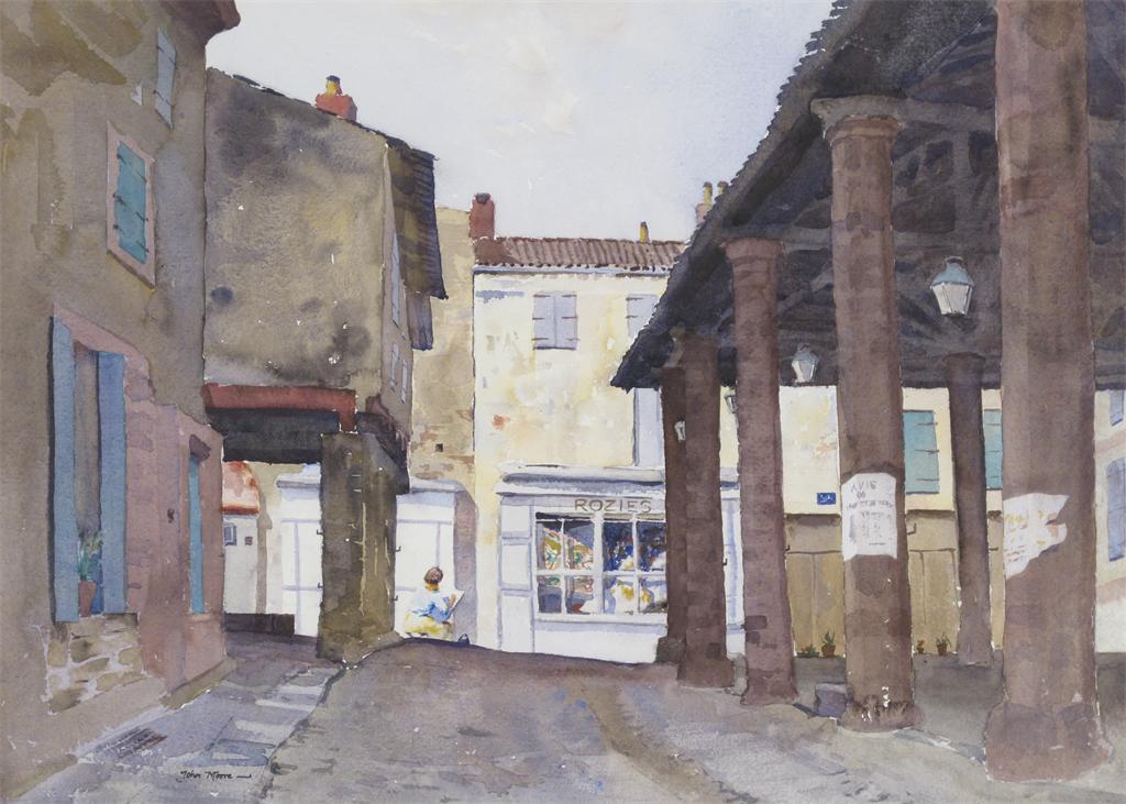 ‡John Moore R.I. (20th Century) Rozies, in the market square, Cordes Signed Watercolour 39 x 55cm; 15½ x 21¾in