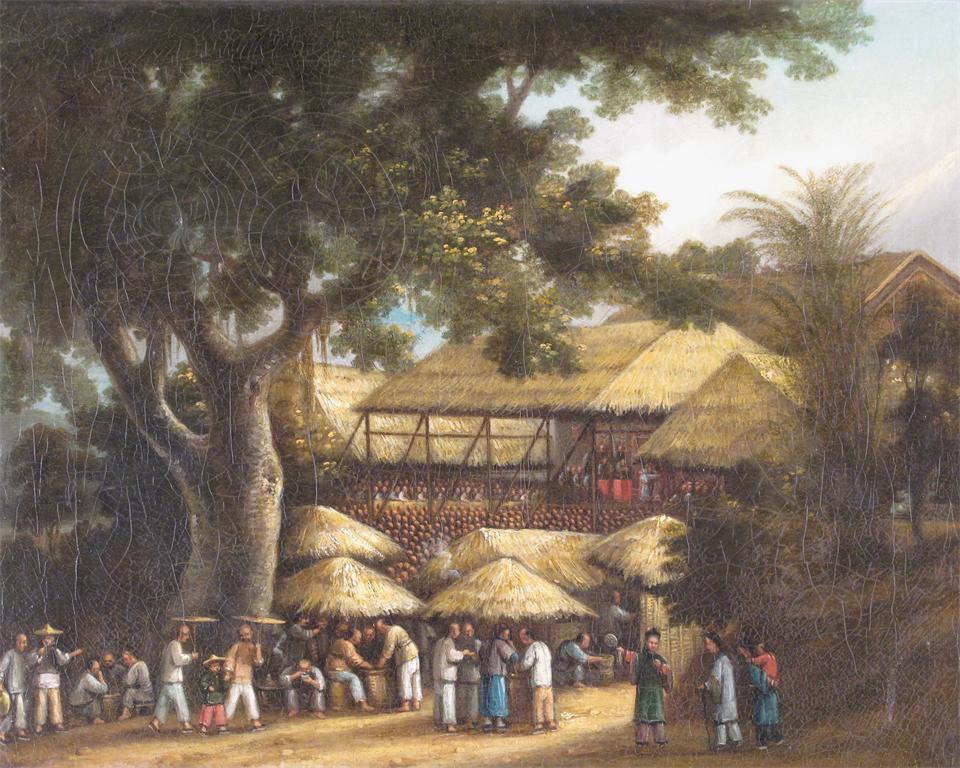Attributed to George Chinnery (1774-1852) A market scene, probably Macao Oil on canvas 46 x 60cm; 18 x 23¾in