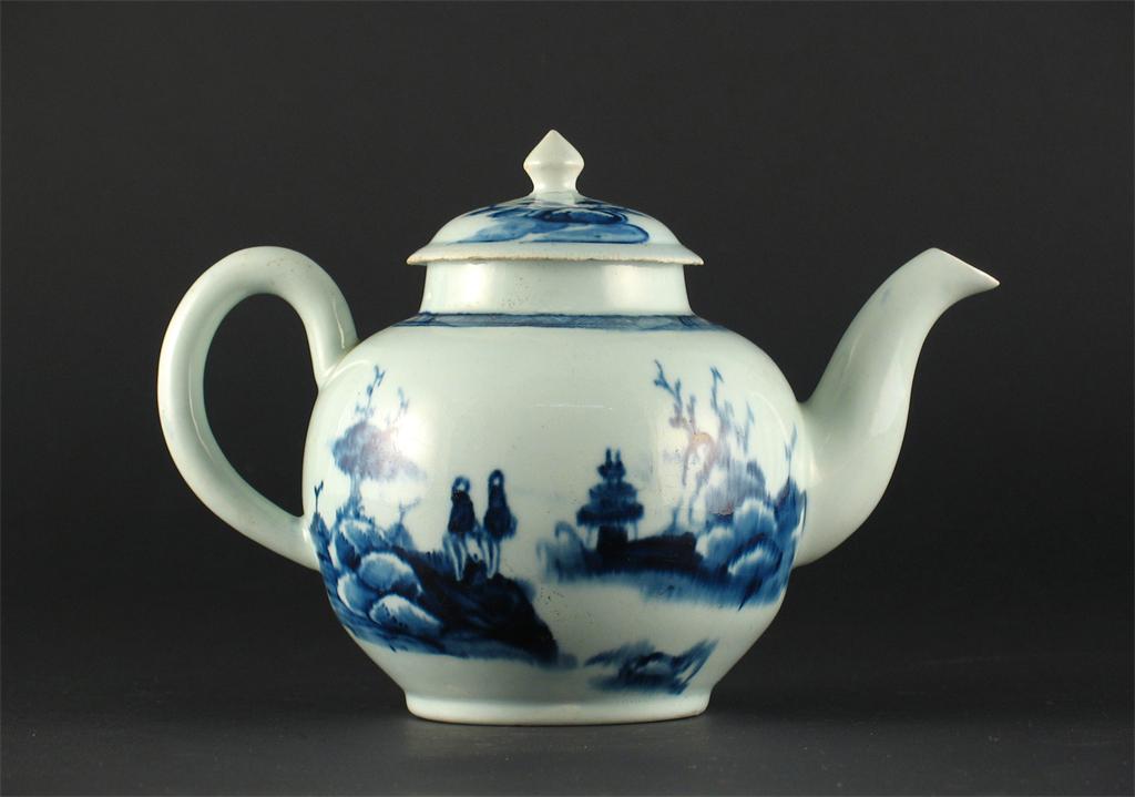 A Chaffers Liverpool blue and white teapot and cover, each side painted with two figures standing on rocks in a watery landscape. The knop restored, a few small rim nibbles. c.1760, 21cm. (2)