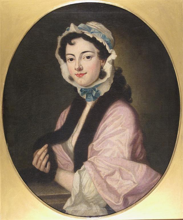 English School 19th Century Portrait of Peg Woffington Helf length, standing Oil on canvas, oval 75 x 62cm; 29½ x 24½in