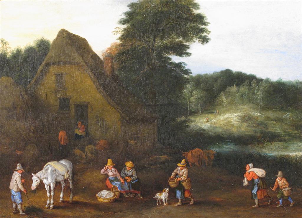 Flemish School (18th Century) Peasants preparing for market Oil on panel 35 x 49cm; 13¾ x 19in