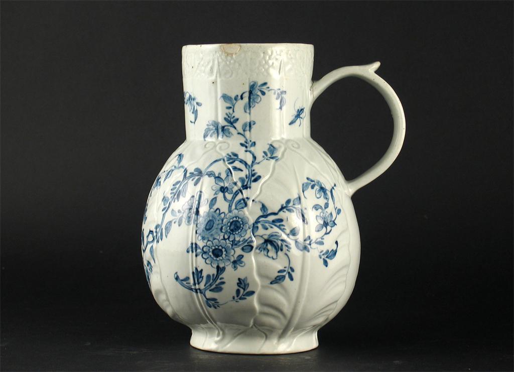 A Worcester cabbage-leaf moulded jug, painted in blue with flower trails, workman's mark to the base of the handle. Some damages. c.1760, 19cm.