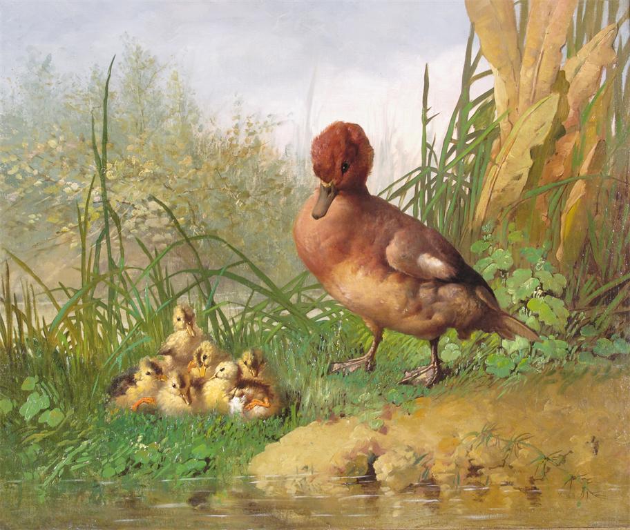 Attributed to Narcisse Vivien (French 20th Century) A duck and her chicks by a river Signed Oil...