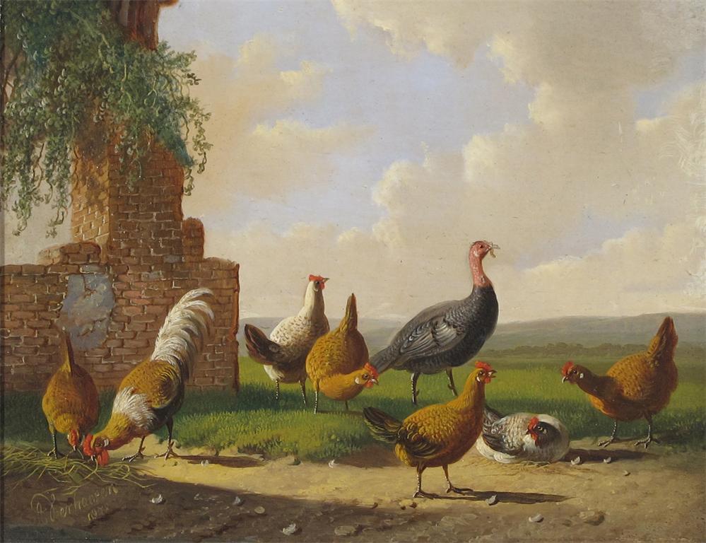 Albertus Verhoesen (Dutch 1806-1881) Chickens and a turkey by a ruin Signed and dated 1878 Oil on...