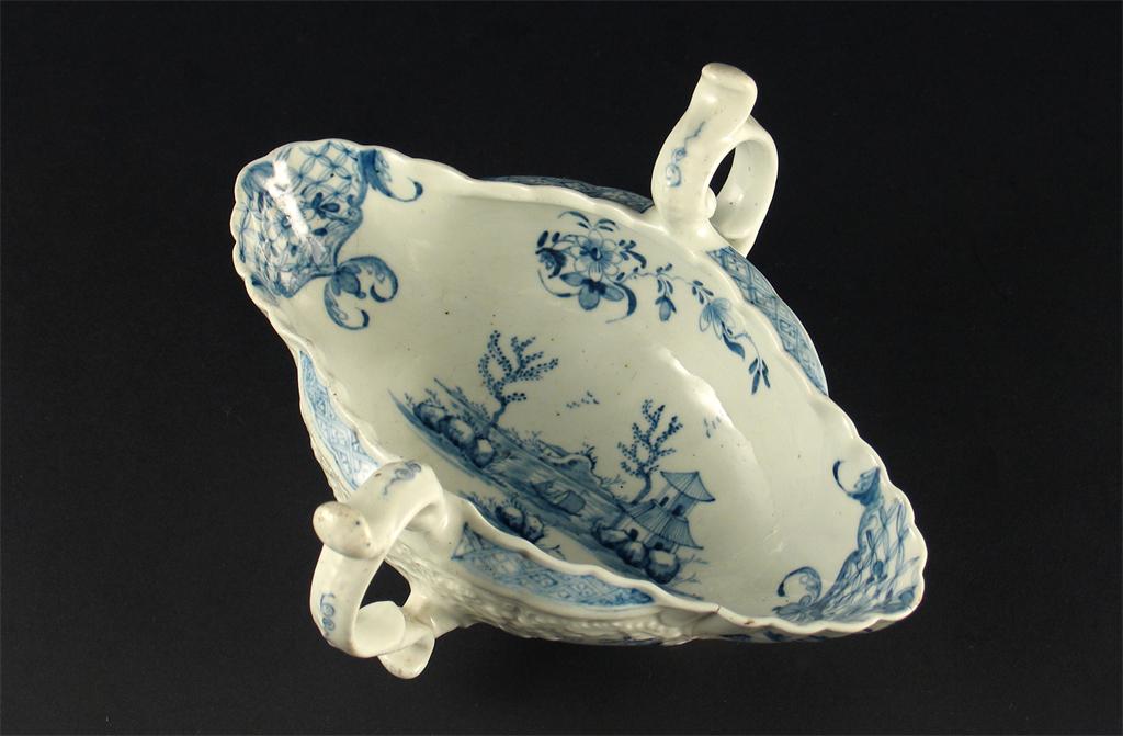 A Worcester blue and white double ended sauceboat, decorated with the 'Two-Handled Sauceboat Landscape' pattern, workman's mark. A 5cm rim crack. c.1760, 19cm.
