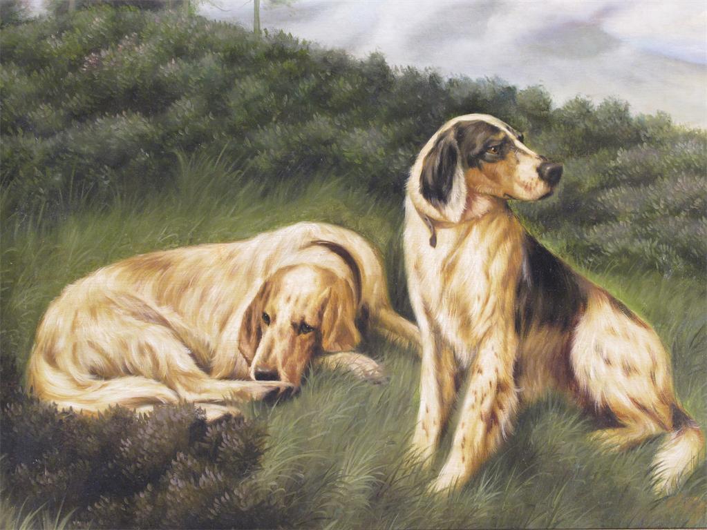 English School 20th Century Setters resting in heathland Oil on canvas 46 x 61cm; 18 x 20in