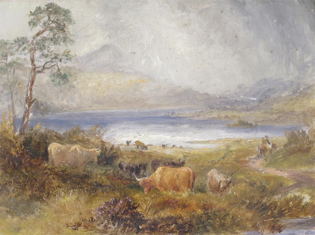 Scottish School 19th Century A loch with highland cattle Oil on board 26.5 x 36cm; 10½ x 14¼in