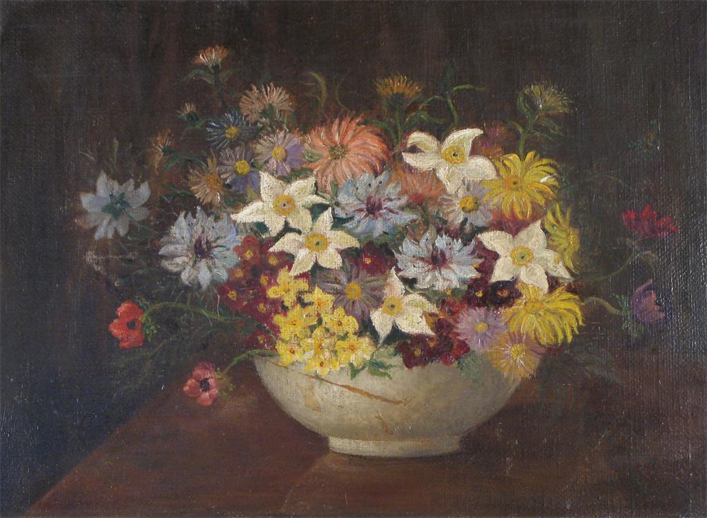 English School 20th Century Still life of flowers in a bowl Oil on board 40.5 x 57cm; 16 x 22½in