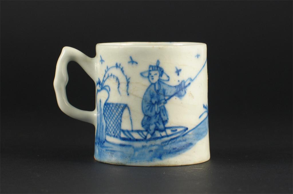 A Bow coffee can, painted in blue with the 'Cross-legged Chinaman' pattern, the reverse with a fisherman in a boat. Glaze cracks and a tiny glaze flake. c.1750-55, 5.5cm. Cf. The Watney Collection Part I, lot 36.