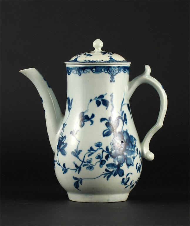 An early Worcester coffee pot, with an associated cover, painted in blue with the 'Mansfield' pattern, workman's marks. Minor faults. c.1760, 16cm. (2)