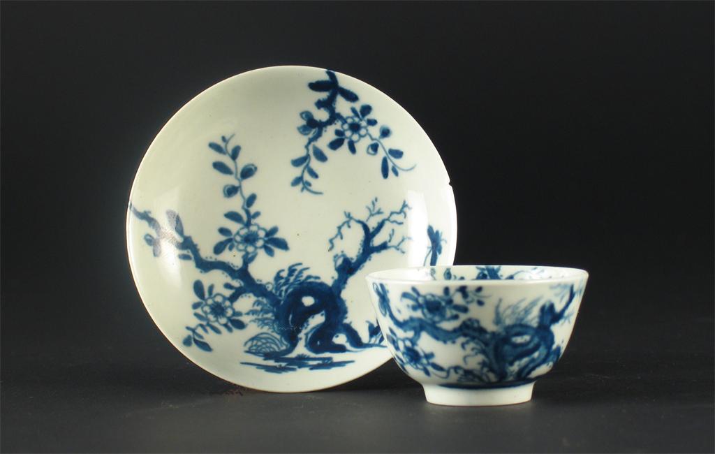A small Worcester blue and white teabowl and saucer, painted with the 'Prunus Root' pattern, each piece with a workman's mark. Each piece with damage. (2)