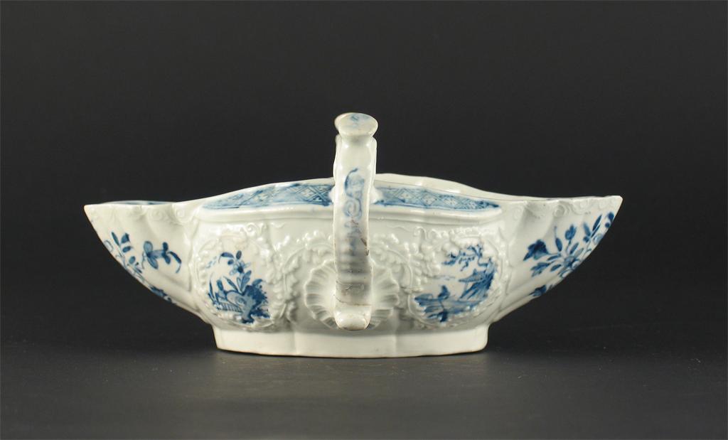 A Worcester two-handled sauceboat, painted in blue with the 'Two-handled Sauceboat Landscape' pattern, workman's marks. Some damage. c.1760, 19cm.