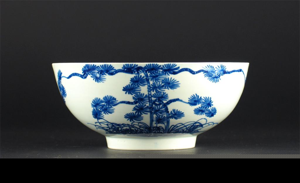 An unusual Vauxhall blue and white bowl, brightly painted with a stylized pine tree and with a rocky island to the reverse, the interior with hatched bands, c.1755, 14.2cm. Provenance: Roderick Jellicoe.