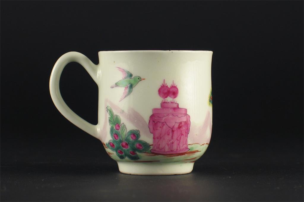 A Worcester coffee cup, brightly painted with the 'Valentine' pattern. Two minute chips to the rim. c.1760.