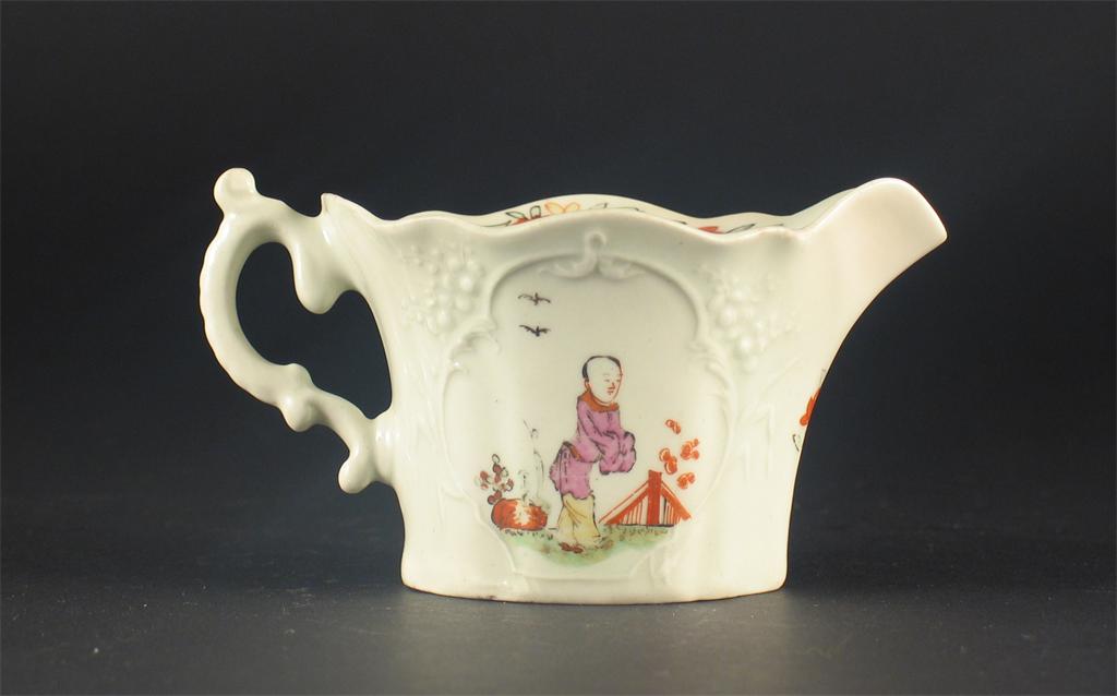 A Worcester cream boat, painted with two panels of Chinese children, unmarked. Restoration to the rim. c.1760, 11cm.