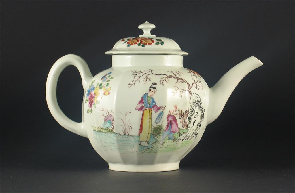 A fluted Worcester teapot and cover, painted with the 'Beckoning Chinaman' pattern, unmarked. Some restoration to the spout and cover. c.1760-70. (2)