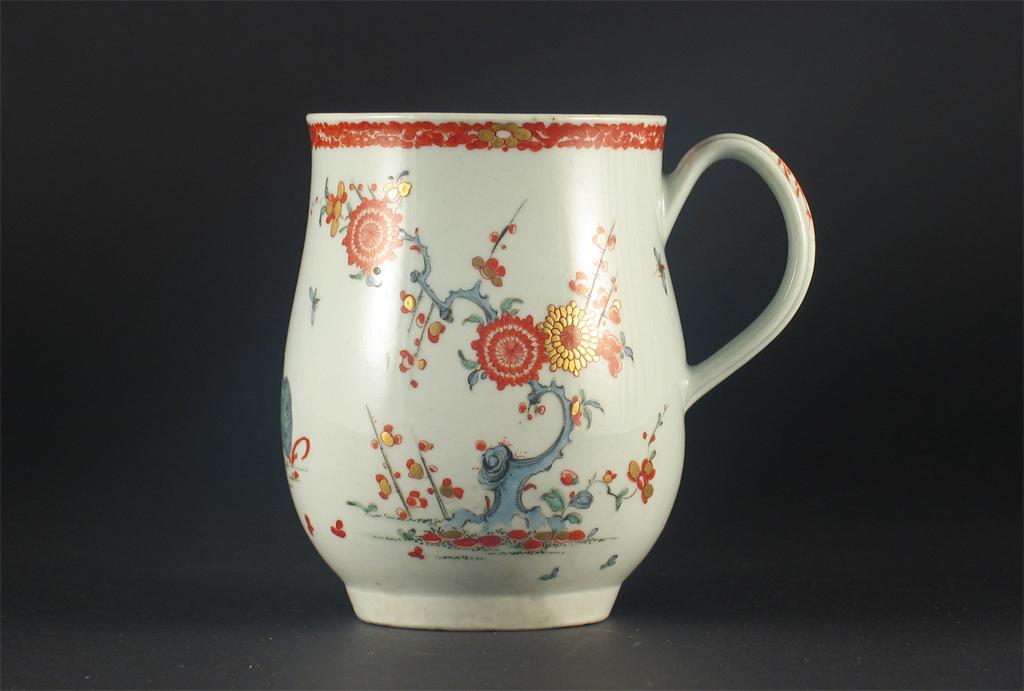 A Worcester mug, painted in the Kakiemon palette with the 'Quail' pattern, unmarked. A small restored rim chip. c.1765, 12cm.