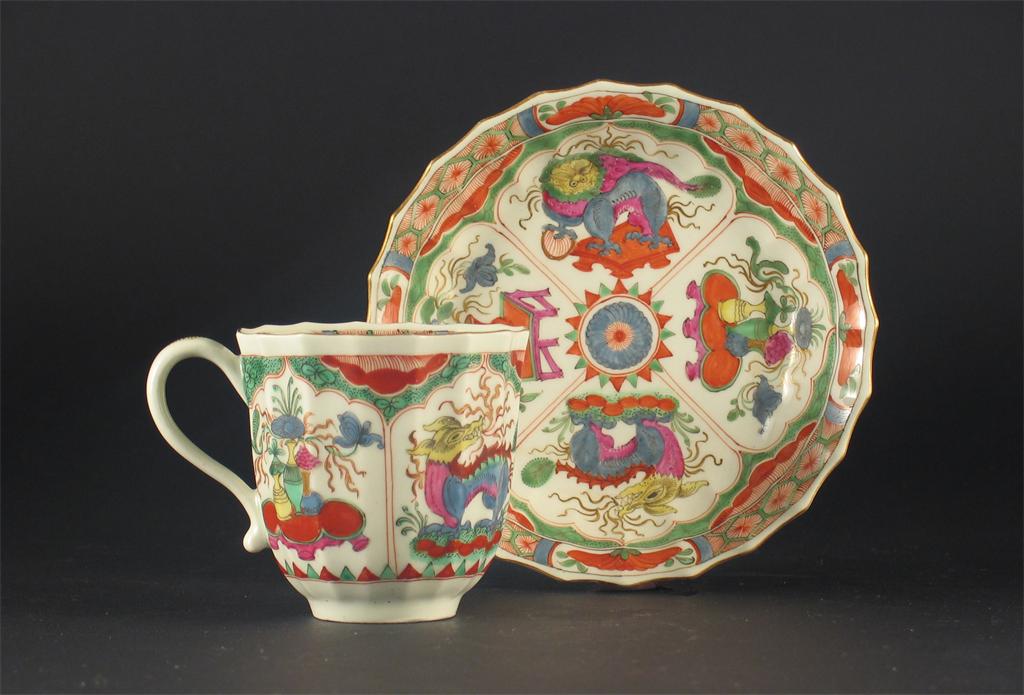 A fluted Worcester cup and saucer, decorated with the 'Dragons in Compartments' pattern, square seal marks, c.1770. (2) Ex. Wills Collection.