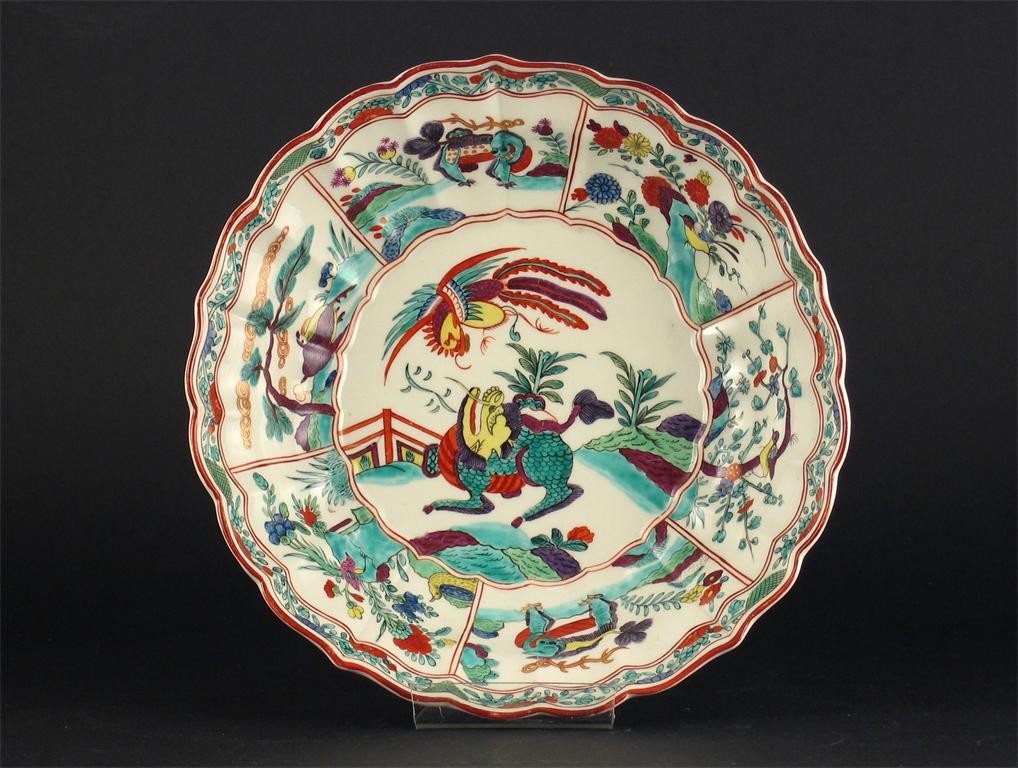 A Worcester shallow bowl, brightly painted with a phoenix and a lion dog within border panels of birds and further mythical beasts, a puce Flight mark, late 18th century, 23cm.