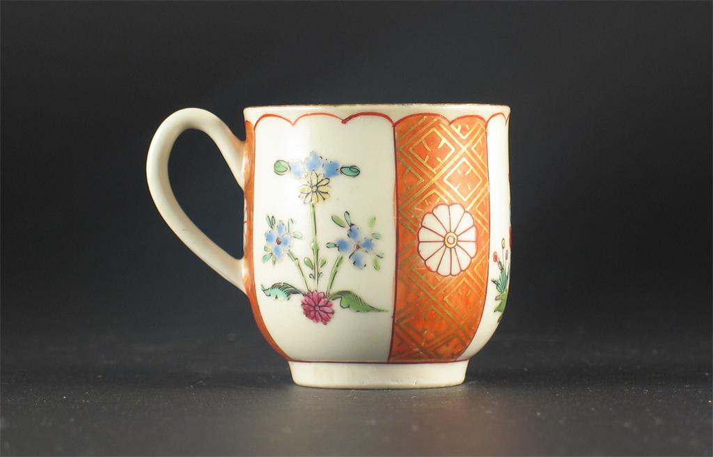 A Worcester coffee cup, painted with flowers and a Chinese figure between orange bands, unmarked. Restored rim chips. c.1770.
