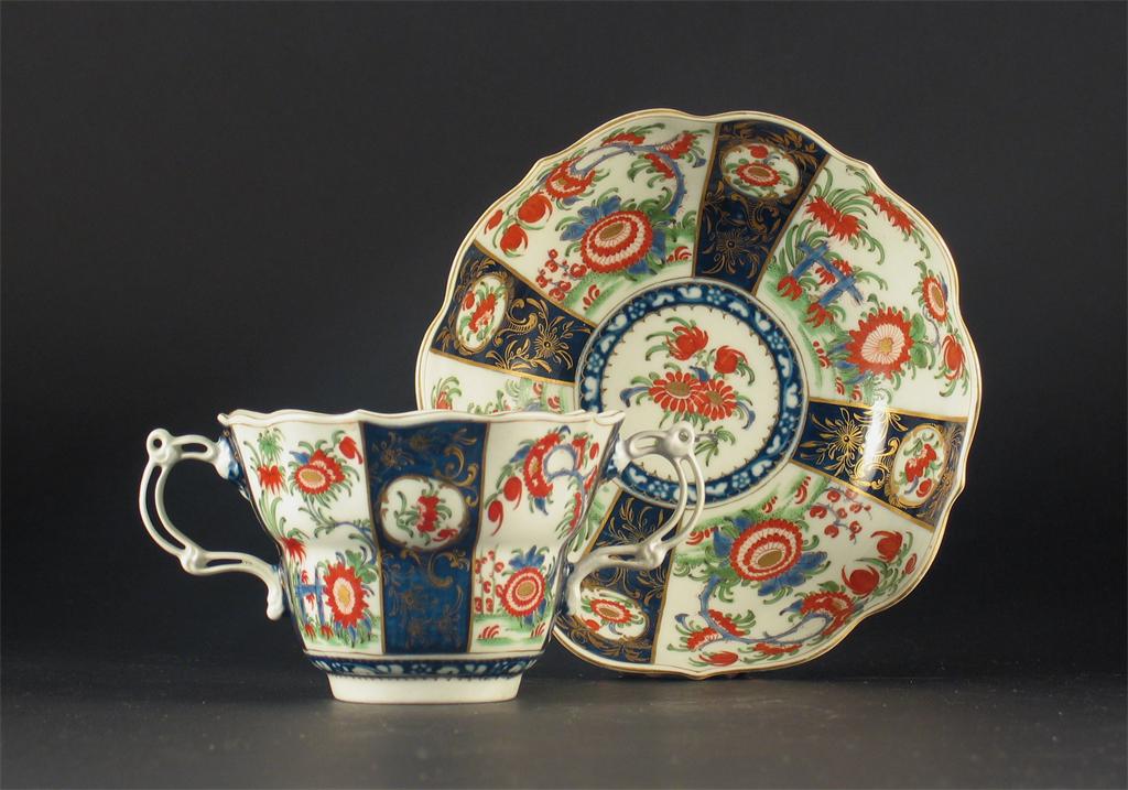 A Worcester chocolate cup and saucer, painted with Kakiemon panels on a blue ground, square seal marks. Some restoration. c.1770. (2) Cf. Spero & Sandon, The Zorensky Collection, no.304