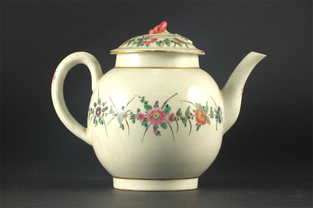 A teapot and cover, probably Caughley, painted with bands of coloured flowers and leaves, unmarked. The knop restored. c.1770, 17cm. (2)