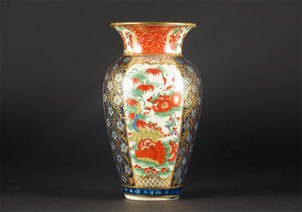 A Worcester vase, painted with panels in the Kakiemon palette on a blue and gilt floral ground, blue seal mark. Some restoration to the rim. c.1770, 16cm.