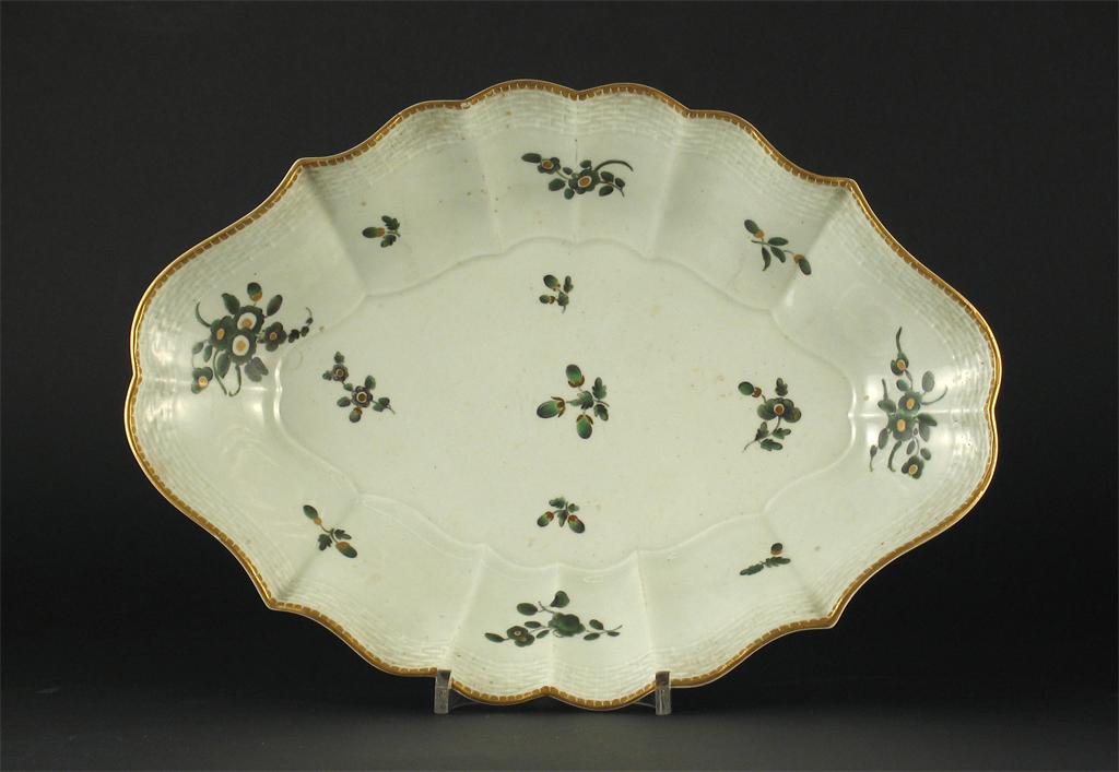 A Worcester dish, with a basket moulded border, painted with green and gilt flower sprigs, no marks, c.1770, 31cm.