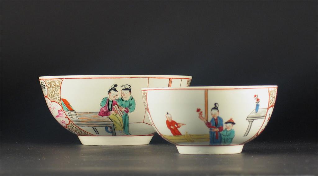 Two Worcester bowls, each painted with panels of Chinese figures divided by smaller panels on a gilt ground, possibly from the Giles workshop, unmarked, c.1770, 15.5cm. and 12cm. (2)