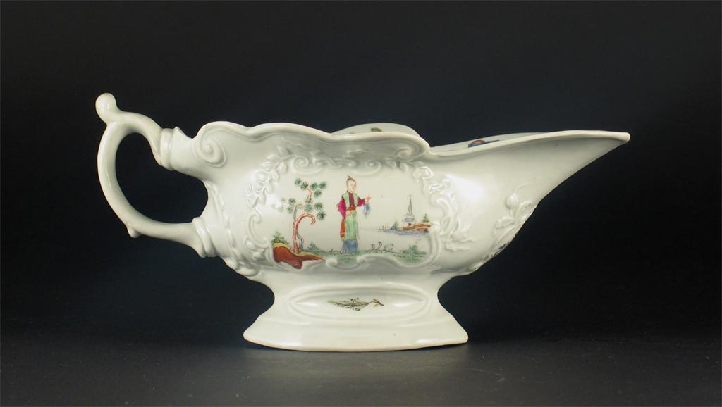 An early Worcester silver-shape sauceboat, painted with a Chinese figure to each side, one holding a fan, the other a flower, unmarked. Minor faults. c.1754, 19cm.