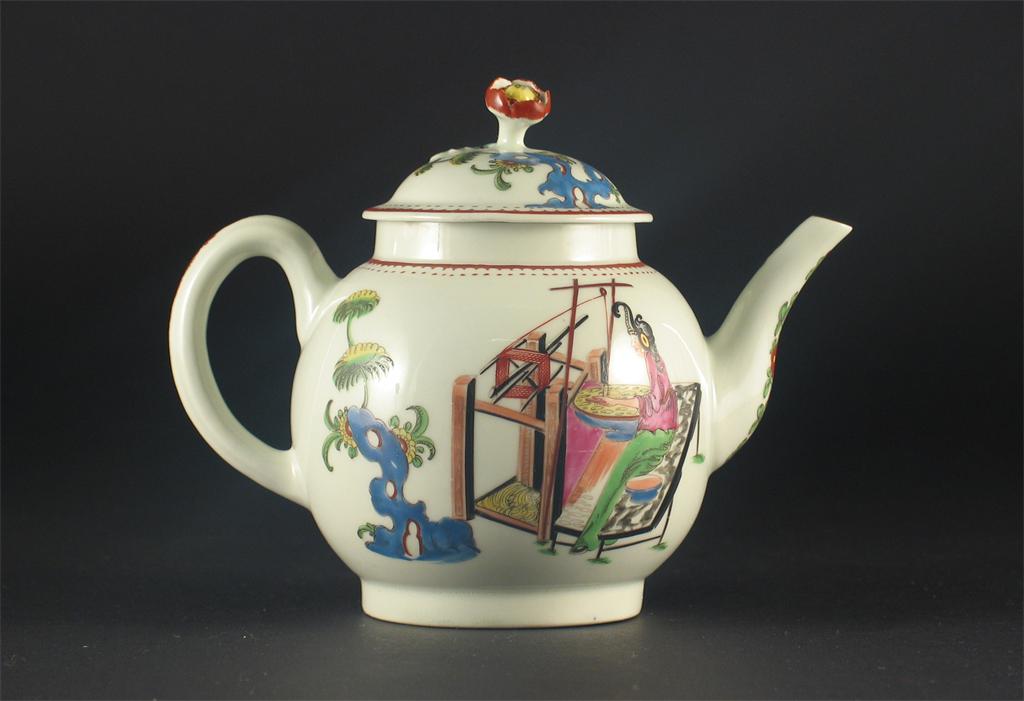 A Worcester teapot and cover, painted with 'The Lady at The Loom' pattern, unmarked. Restoration to the knop and the rim of the cover. c.1765-70. (2) Cf. Spero & Sandon, The Zorensky Collection, no.182 for a jug in this pattern.