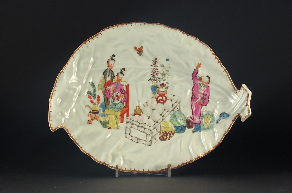 A Worcester leaf moulded dish, painted in polychrome enamels with the 'Magician' pattern, unmarked. Some wear to the enamels. c.1760, 25.5cm. Cf. Spero & Sandon, The Zorensky Collection, no.139.