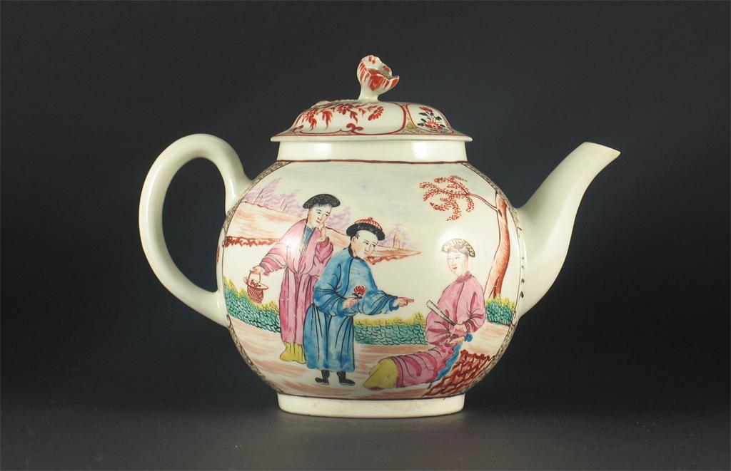 A Worcester teapot and cover, painted with Chinese figures in conversation, unmarked. Some restoration. c.1765-75. (2)