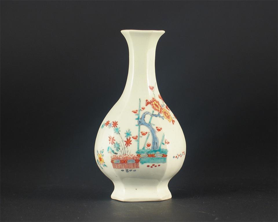 An early Worcester hexagonal bottle, painted in the Kakiemon palette with the 'Banded Hedge' pattern, unmarked. Restoration to the neck. c.1753-5, 11.5cm. Cf. Spero & Sandon, The Zorensky Collection, no.48.