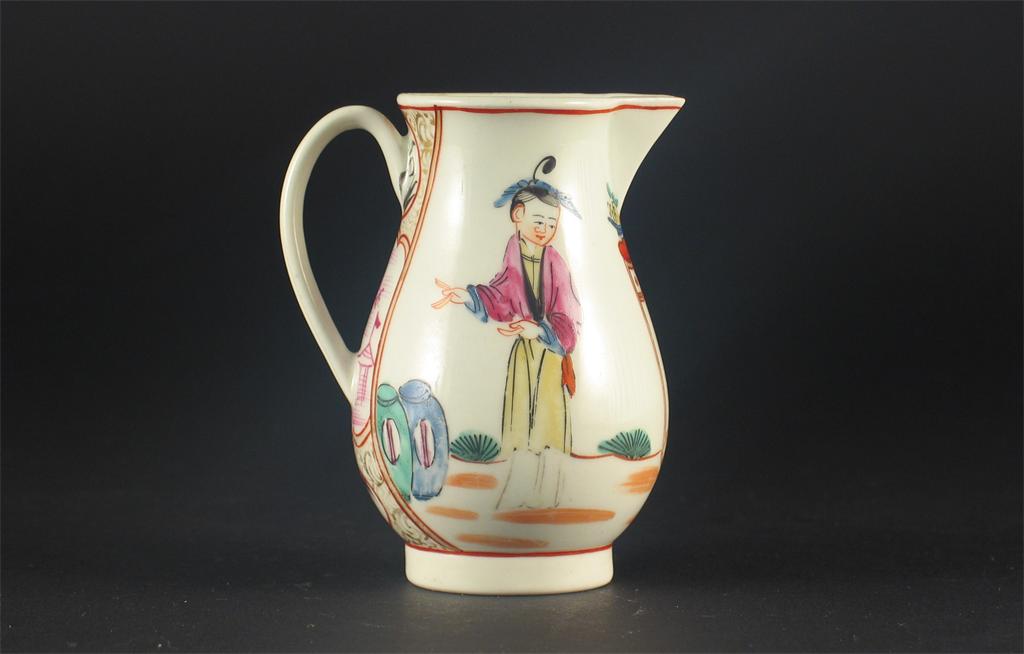 A Worcester sparrow beak jug, painted with two Chinese figures, unmarked, c.1760-70, 9.2cm. Ex. Roderick Jellicoe