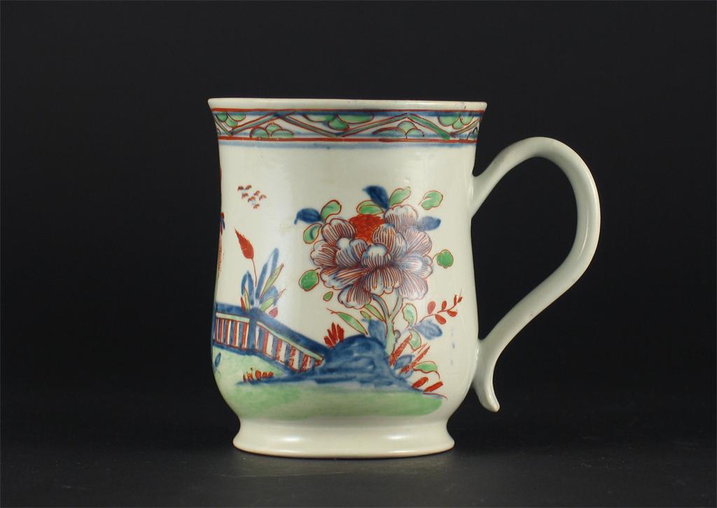 A scratch cross period Worcester mug, with a grooved loop handle and short flared foot, painted in underglaze blue and enamelled in red and green with flowers, a fence and rockwork, a blurred workman's mark and two incised lines to the base. The enamelling later, a well restored rim crack. c.1754, 9.4cm.